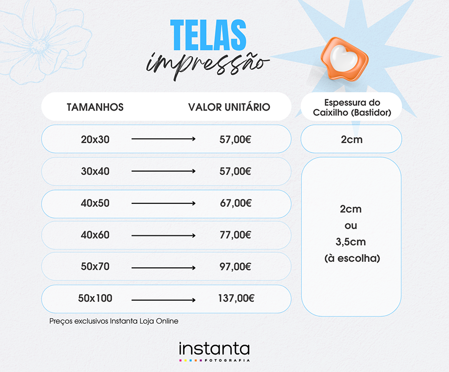 As suas melhores memórias merecem um lugar de destaque. Dê vida às suas imagens favoritas com um toque artístico e sofisticado. As nossas Telas Premium são ideais para destacar momentos especiais, criar ambientes acolhedores ou surpreender com um presente original e cheio de personalidade.