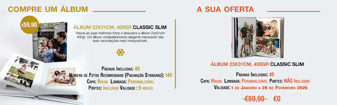ÁLBUM DIGITAL CLASSIC SLIMO Álbum Digital Classic Slim, tal como o seu nome indica, é um Clássico e o preferido pelos nossos clientes. É um Álbum com formato vertical e muito elegante para guardar as tuas melhores memórias. Este formato de Álbum é muito escolhido para eternizar os Natais em família, para fazer o Álbum do Batizado ou o Álbum da Comunhão. Está disponível em papel fotográfico de 400gr, uma folha fina e levemente flexível.